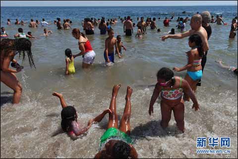 7月4日,人们在美国纽约康尼岛海滨消暑纳凉。当日,纽约市最高气温达到36摄氏度,很多市民前往海滩度过国庆节周末。