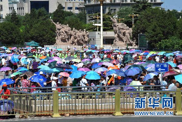 7月6日,打着各式遮阳伞的游客在天安门广场游览。